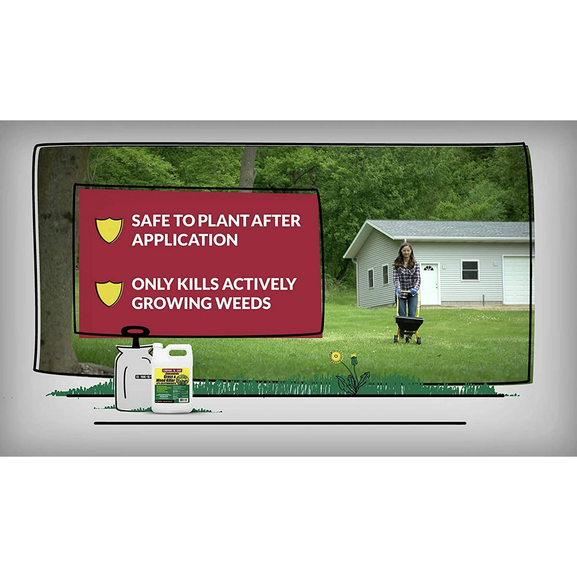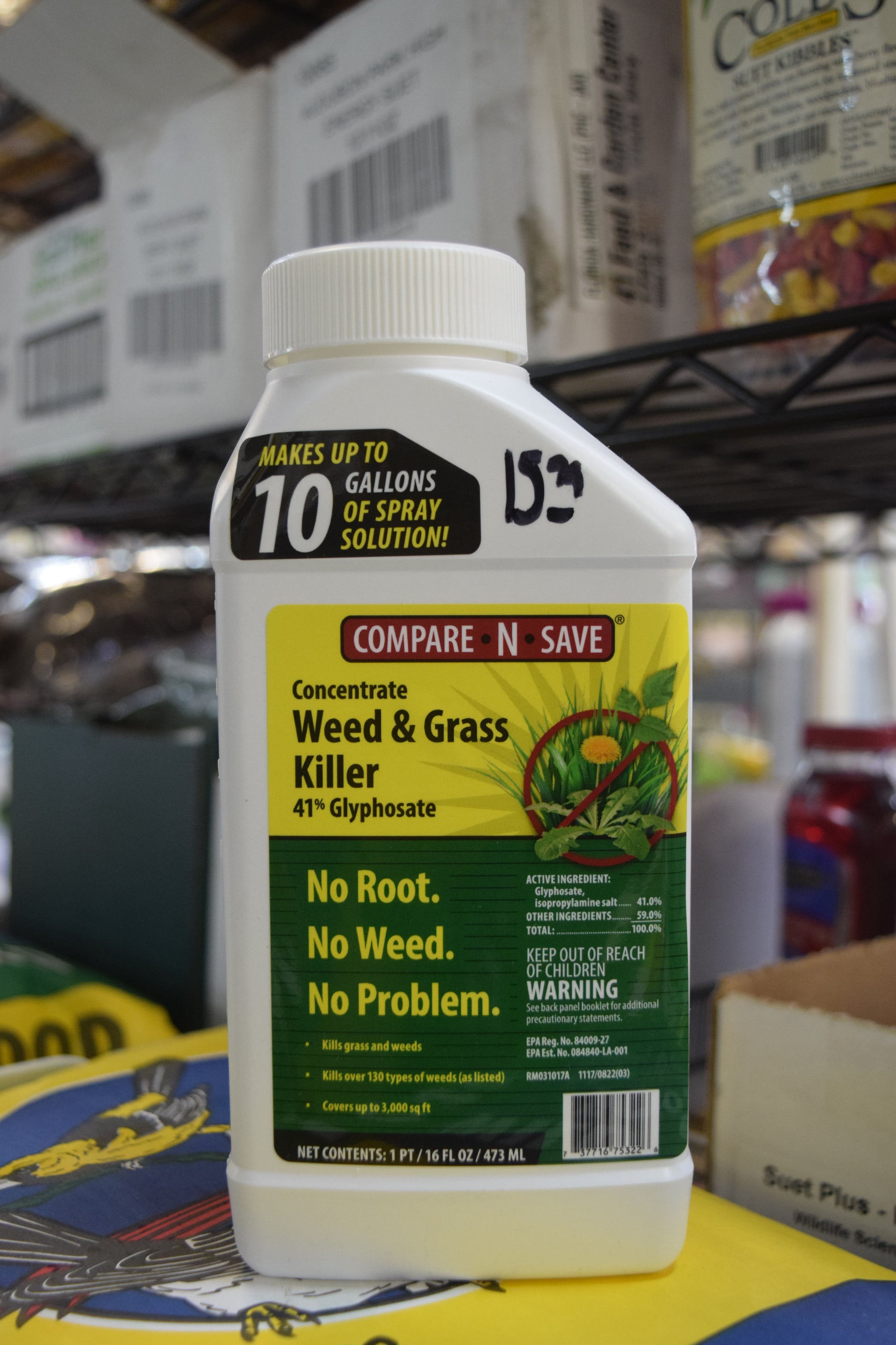 Get to the root and kill grass and weeds with Compare-N-Save 41-percent Glyphosate Concentrate Grass and Weed Killer. Use for lawn or garden replacement, on patios, walkways, or in and around fences and gardens to remove unwanted grass and weeds. Visible results in as little as 2 to 4 days. Rainproof in 2 hours. Use 1.5 ounces (3 tablespoons) of concentrate in 1 gallon of water for general weed control. For tougher weed control of perennials or brush, mix 2.5 ounces (5 tablespoons) in 1 gallon of water. One gallon of ready-to-use equivalent will cover 300 square feet.