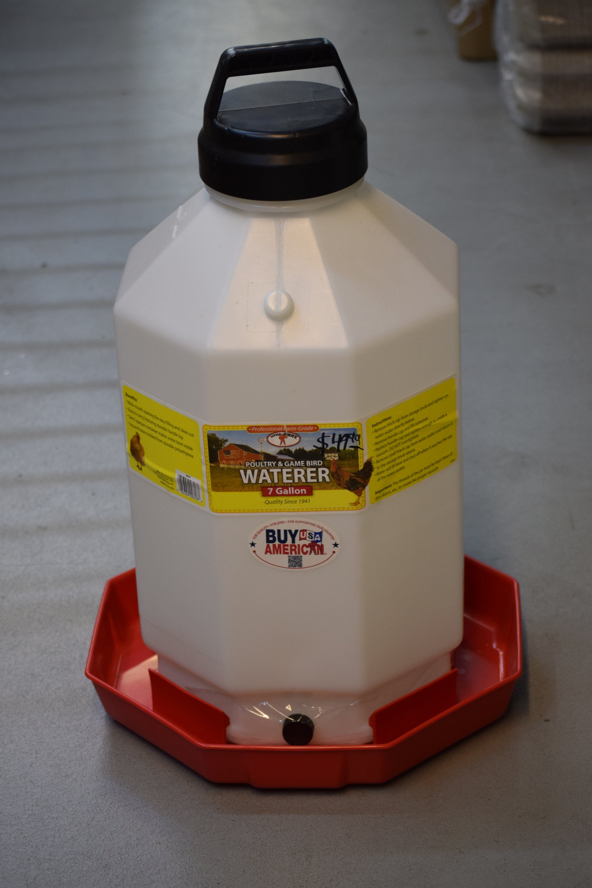 This large-capacity automatic poultry waterer features a vacuum-sealing O-ring cap that creates an automatic water flow. Made of dent-proof, heavy-duty translucent plastic that allows you to see the water level. The easy-to-fill jar snaps compactly onto the base and the rugged handle makes transport around the yard easy. This is a durable unit that will stand up to plenty of use. 16 in D octagon by 24 in H, holds 7 gal.