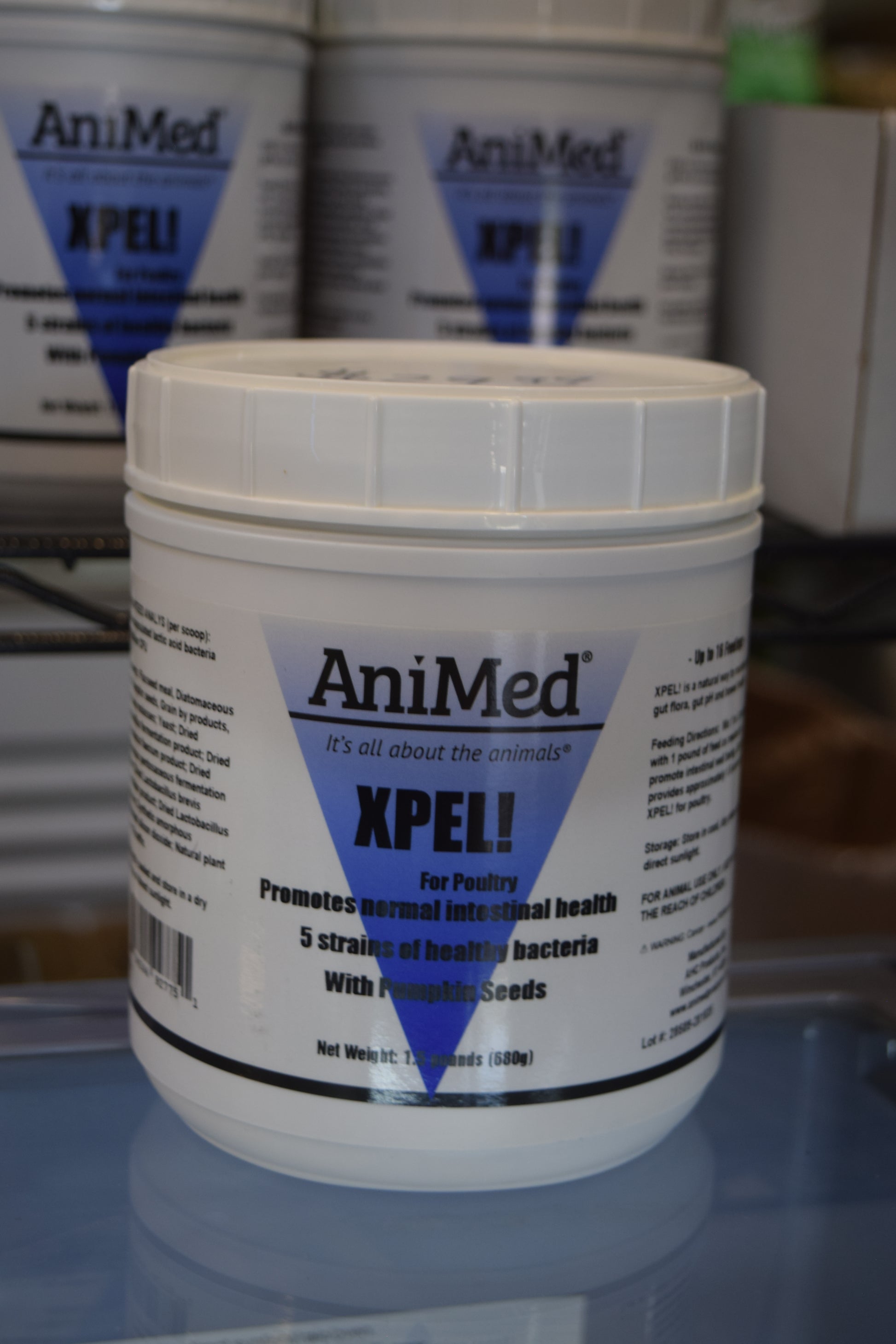 Xpel is a natural way to maintain proper gut flora, gut pH, and bowel health in poultry. Includes 5 strains of healthy bacteria to promote normal intestinal health. With pumpkin seeds. Mix 1-3 scoops with 1 lb. of feed.