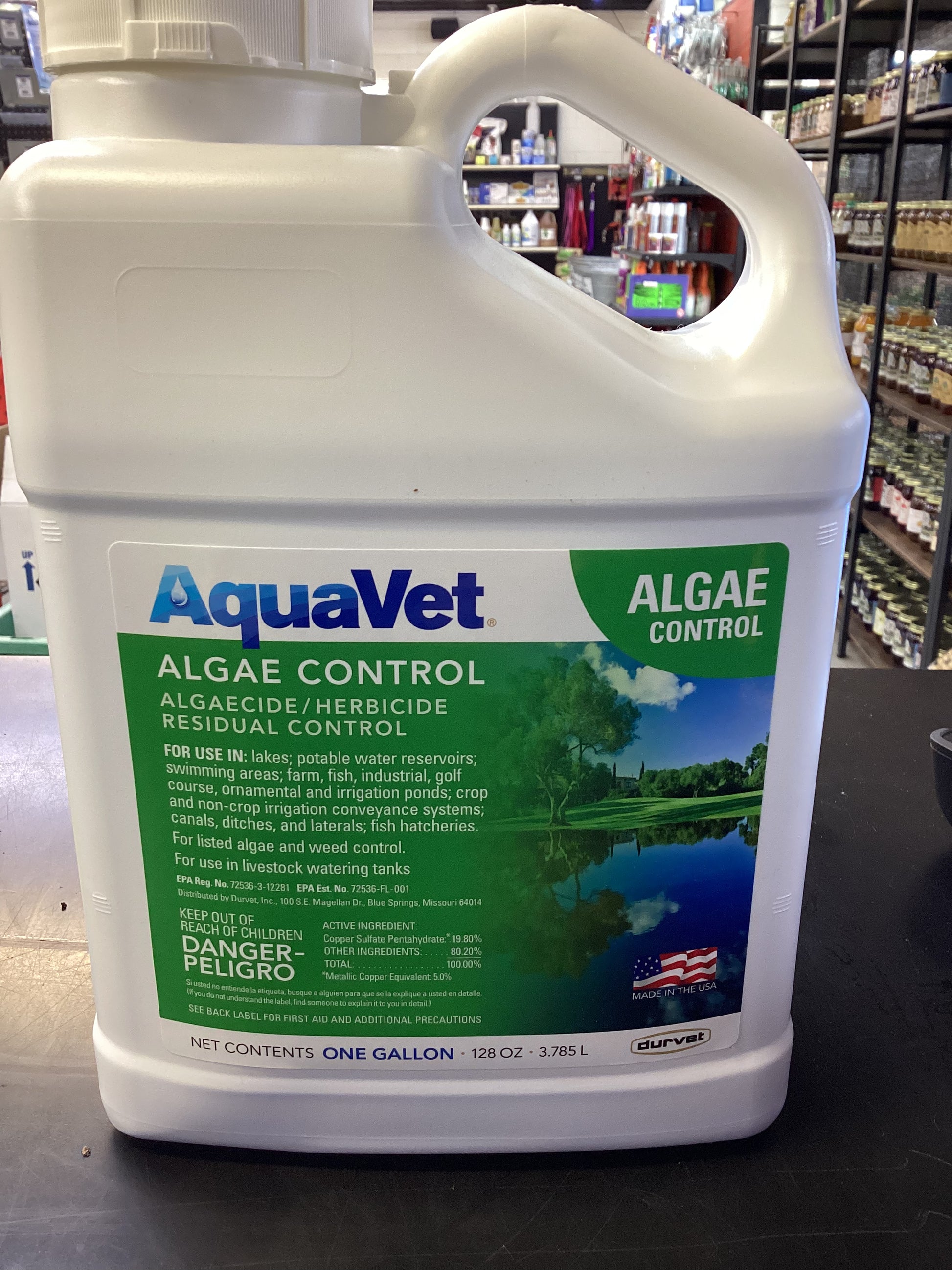AquaVet Algae Control is effective in controlling a broad range of algae including: Chara, Spirogyra, Cladophora, Ulothrix, and Oscillatoria. In addition, AquaVet Algae Control is effective in controlling rooted and floating aquatic plants such as Hydrilla, Potomogeten sp., and Water Hyacinth. The formulation of AquaVet Algae Control protects against the precipitation of copper with carbonates and bicarbonates in the treated water and results in increased time of exposure for true residual activity. In addition, this formulation allows for application at any time – including overcast/cloudy conditions as well as during nighttime hours. For best results, apply when livestock water consumption is low or watering area is not in use.
