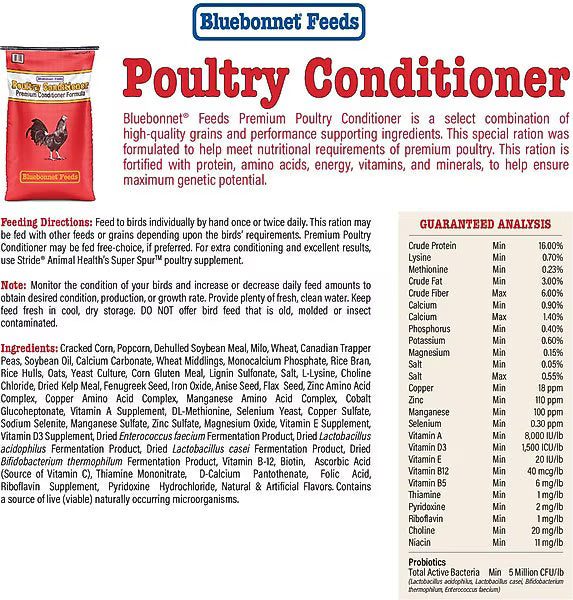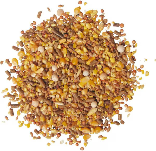 ingredients: Cracked Corn, Popcorn, Dehulled Soybean Meal, Milo, Wheat, Canadian Trapper Peas, Soybean Oil, Calcium Carbonate, Wheat Middlings, Monocalcium Phosphate, Rice Bran, Rice Hulls, Oats, Yeast Culture, Corn Gluten Meal, Lignin Sulfonate, Salt, L-Lysine, Choline Chloride, Dried Kelp Meal, Fenugreek Seed, Iron Oxide, Anise Seed, Flax Seed, Zinc Amino Acid Complex, Copper Amino Acid Complex, Manganese Amino Acid Complex, Cobalt Glucoheptonate, Vitamin A Supplement, DL-Methionine, Selenium Yeast, Copper Sulfate, Sodium Selenite, Manganese Sulfate, Zinc Sulfate, Magnesium Oxide, Vitamin E Supplement, Vitamin D3 Supplement, Dried Enterococcus Faecium Fermentation Product, Dried Lactobacillus Acidophilus Fermentation Product, Dried Lactobacillus Casei Fermentation Product, Dried Bifido Bacterium Thermophilum Fermentation Product, Vitamin B-12, Biotin, Ascorbic Acid (Source of Vitamin C), Thiamine Mononitrate, D-Calcium Pantothenate, Folic Acid, Riboflavin Supplement, Pyridoxine Hydrochloride, Ethoxyquin (As a Preservative), Natural & Artificial Flavors, Contains A Source Of Live (Viable) Naturally Occurring Microorganisms.