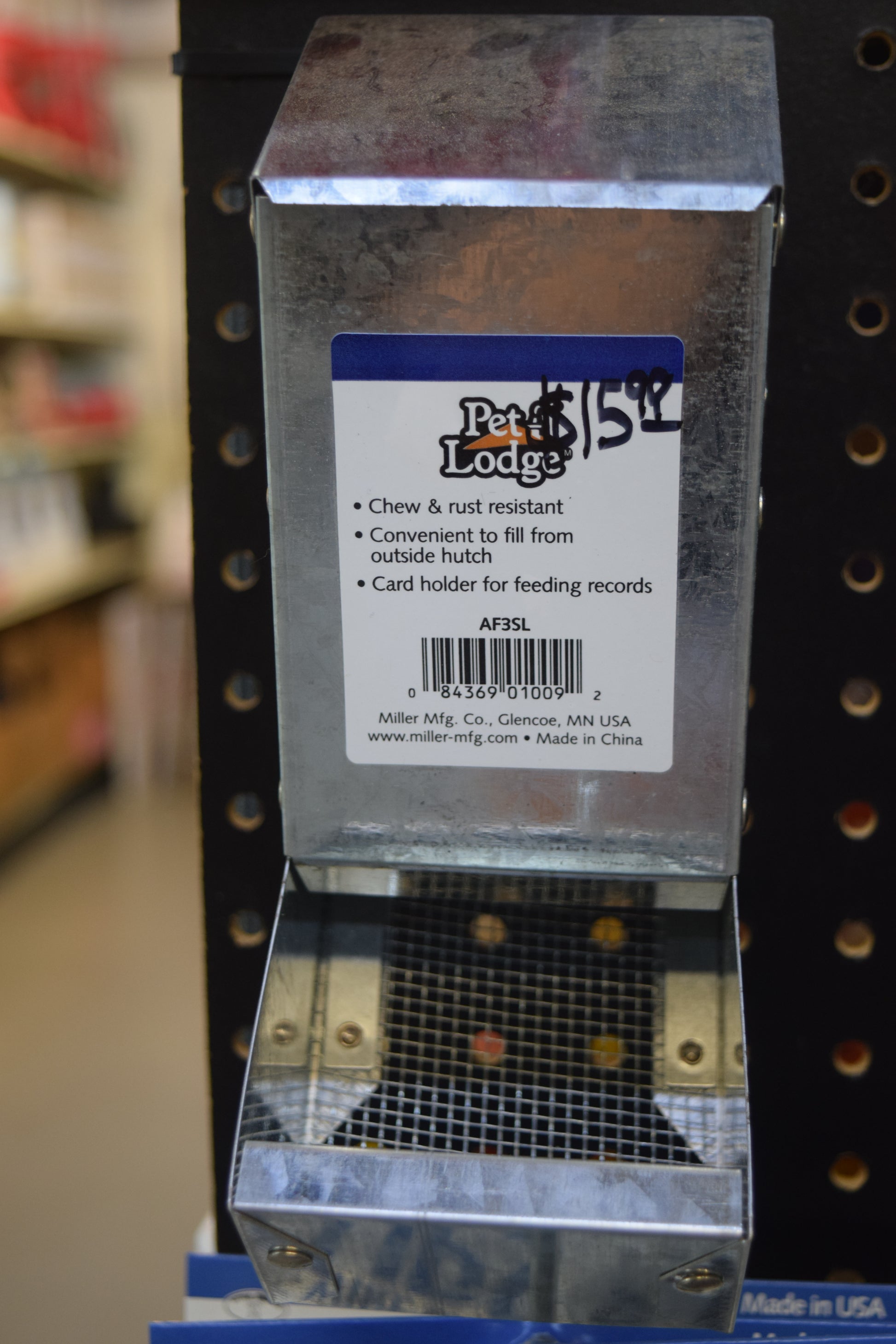This rabbit and small animal feeder comes with independent wire hooks so it can be attached to the inside of the hutch, or for more convenient filling to the outside with some wire cutting. Gravity design allows feeder to dispense several days worth of feed a little at a time. Features hinged metal lid for covering the feed. Made of chew-proof, rust-resistant, heavy-gauge galvanized steel.