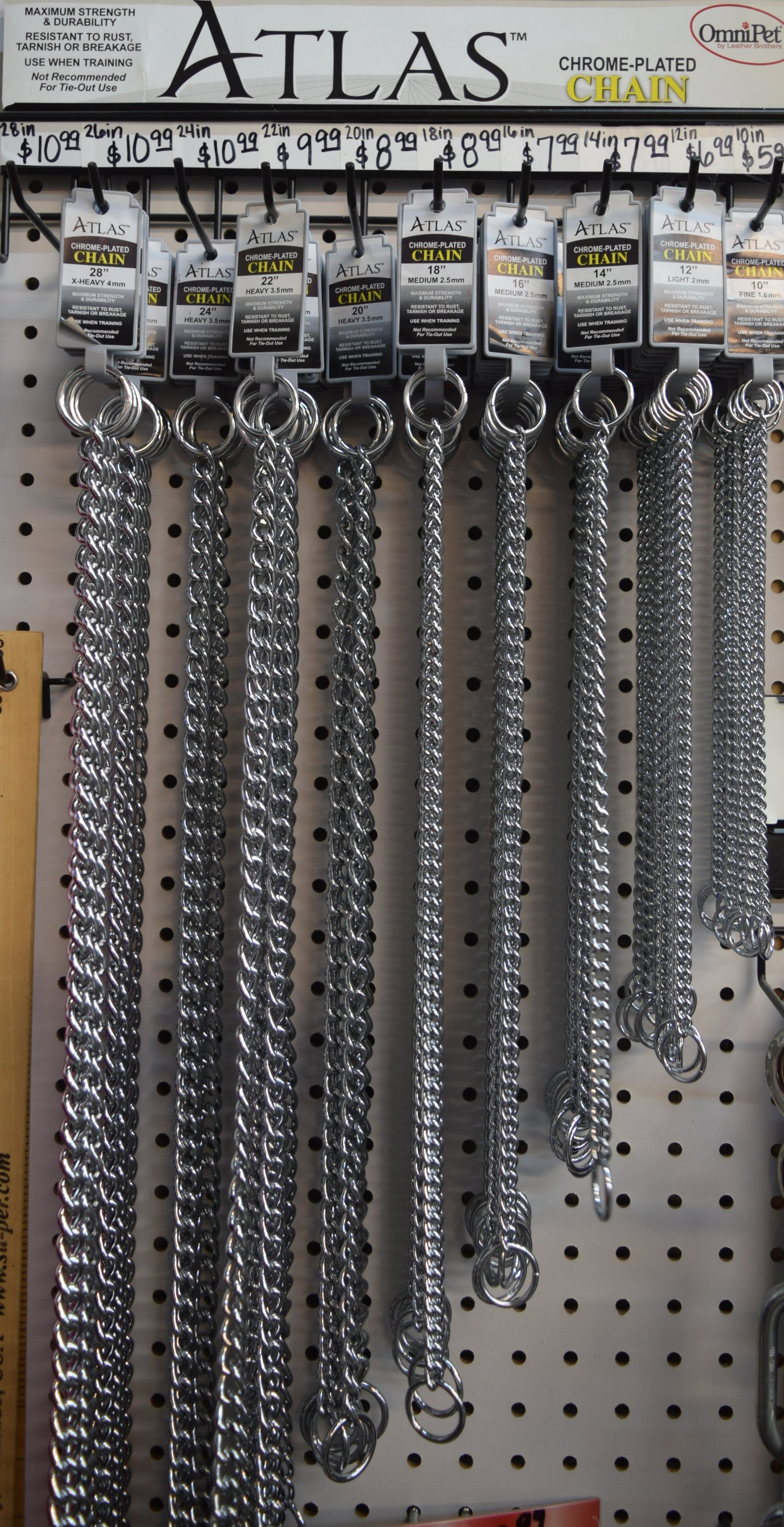 Chrome plated. Rugged and strong. For correct size, measure around the dog’s neck and add 2 1/2—3 inches.