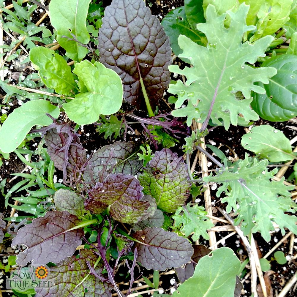 Southern Giant Curl Mustard, Florida Broadleaf Mustard, Crimson Giant Radish, Bloomsdale Spinach, Siberian Curl Dwarf Kale, Dwarf Essex Rape, Purple Top Turnip, Seven Top Turnip