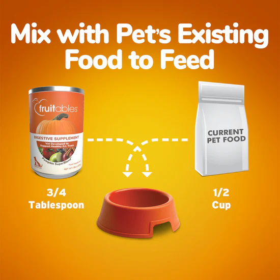 Fruitables pumpkin digestive supplement has great additions of soothing herbs like ginger and spearmint combined with fruit & vegetable fiber and selected vitamins to soothe and help support a healthy GI tract. This is nature’s perfect tummy helper. Great for dogs & cats too!