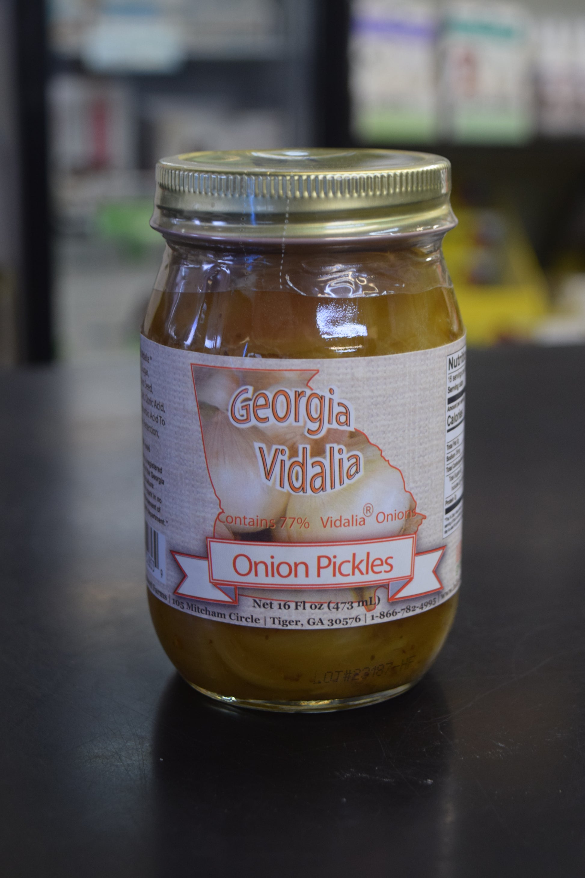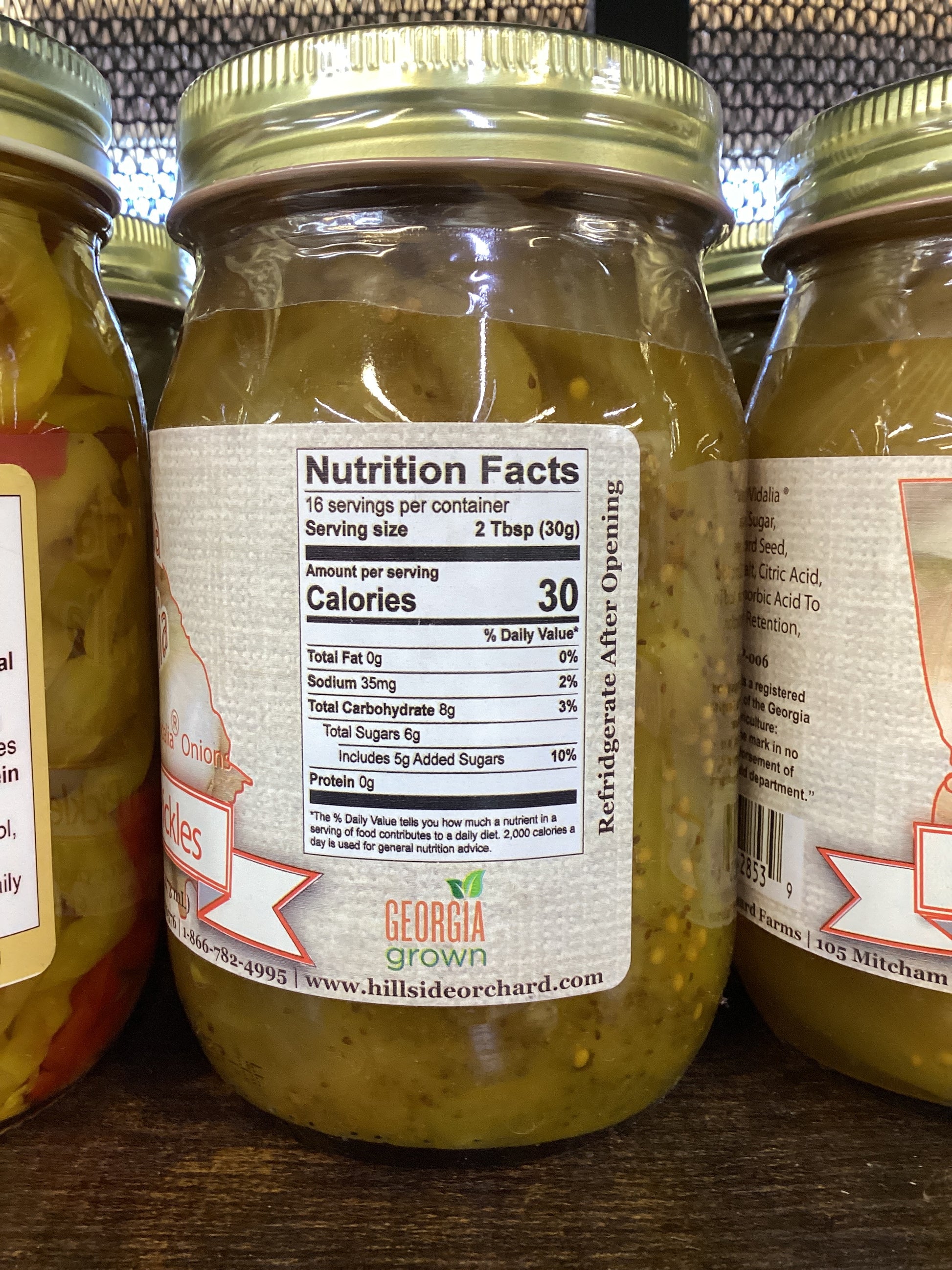 Ingredients: Vidalia onions (77%), sugar, vinegar, mustard seed, celery seed, salt, citric acid, turmeric, erythorbic acid to promote color retention