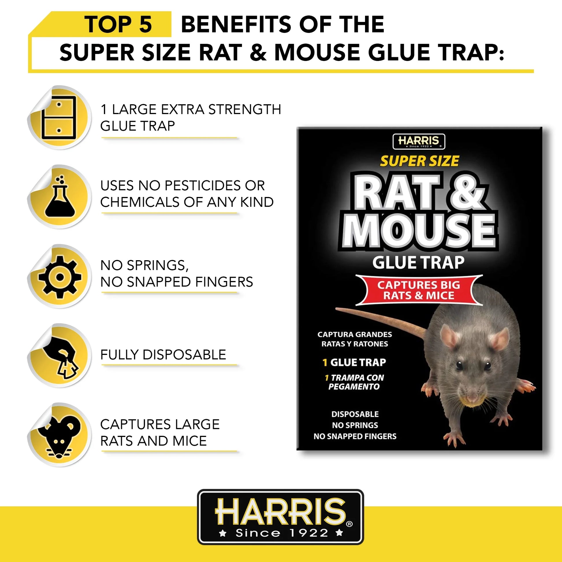 PF Harris Super-Size Rat and Mouse Glue Trap 1 pack. Captures big and small rodents. The easy-to-use trap opens like a book to double in size. The trap can lay flat or place in L shape against a wall. The Trap captures and holds rats, mice, roaches, spiders and other crawling household pests. No springs and no snapped fingers, like ordinary traps. Use indoor or outdoor for effective control of rats and mice. Harris Super-Size Rat and Mouse Glue Trap is Non-Toxic and fully disposable.