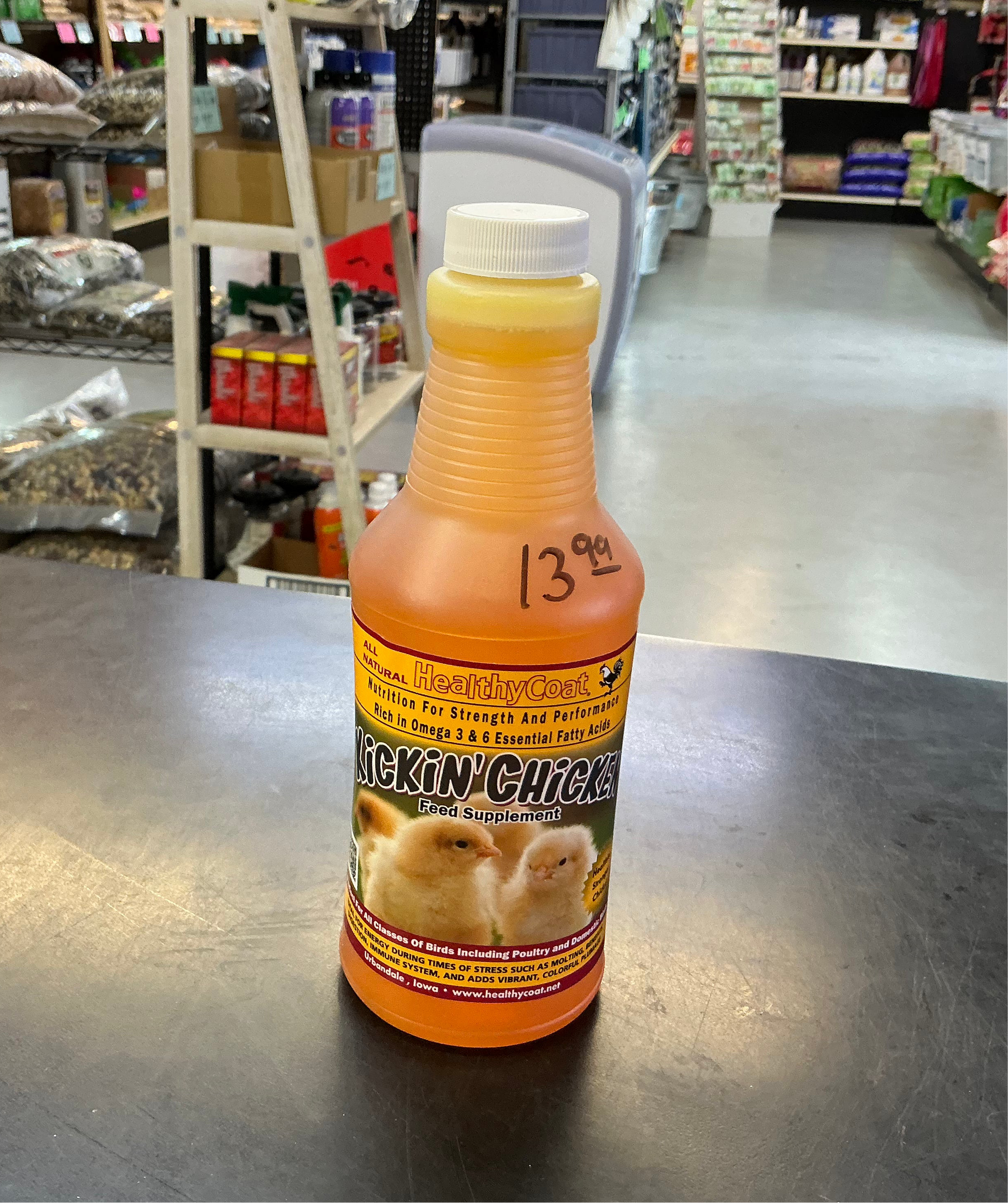 Kickin’ Chicken is our HealthyCoat formulated for your chicken flock. It's an all-natural omega-3 and omega-6 liquid feed that’s easy to implement and mixes right into their feed with noticeable results.