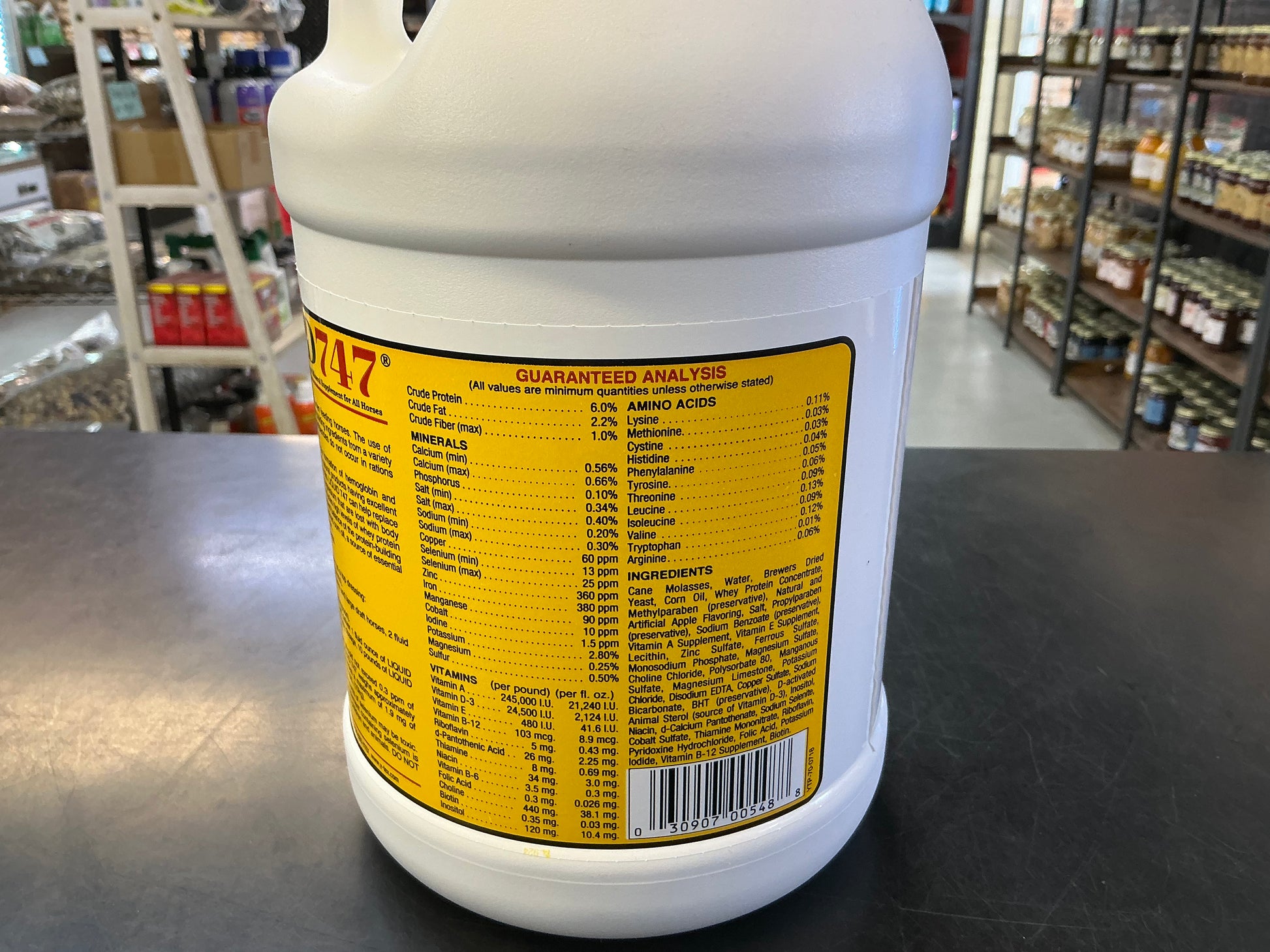 Training and competition increases the nutritional requirements horses need to stay healthy and at their peak of performance. Tuttle's Liquid 747® is composed of all natural ingredients that are easily utilized for maximum feed efficiency. Our highly palatable apple flavored liquid supplement aides in balancing your horse's diet for optimum development, stamina, and appearance. Guaranteed to give your horse's coat a healthy sheen within four weeks or your money back. A complete Vitamin and Mineral supplement for All Horses