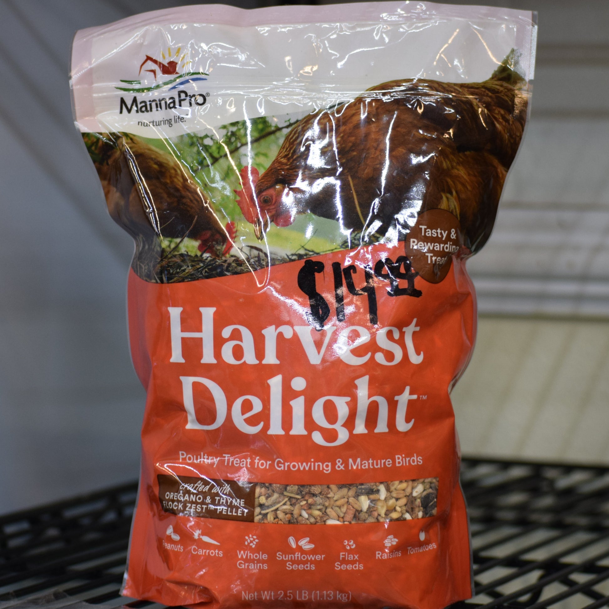 With whole grains and real fruits and vegetables, you can provide a treat year-round t hat contain s the goodness of a bountiful harvest! Peanuts , flax, sunflower seeds and our specially-formulated pellets including oregano and thyme provide nutrition and feeding diversity for your birds. At Manna Pro, we understand that animals are our companions as well as our providers. Whether you raise blue-ribbon show birds or you simply enjoy the eggs and entertainment from your backyard flock, treat your feathered friends with wholesome and delicious Harvest Delight.