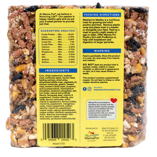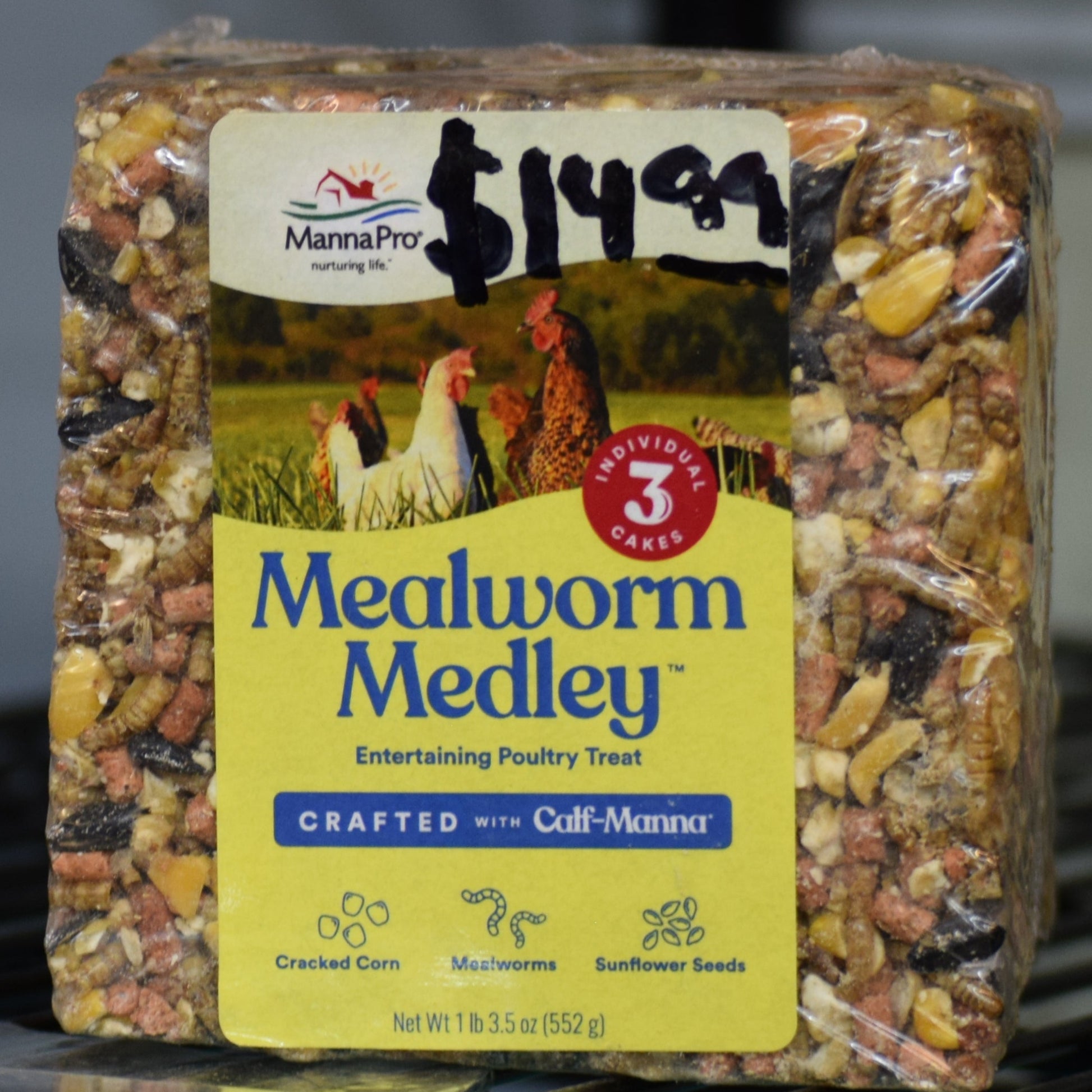 Mealworm Medley is a nutritious treat for adult poultry and fowl. For best results, place Mealworm Medley in the feeding area where it is protected from the elements. Because of the larger particle size, Mealworm Medley is not recommended for birds less than eight weeks of age or very small birds.