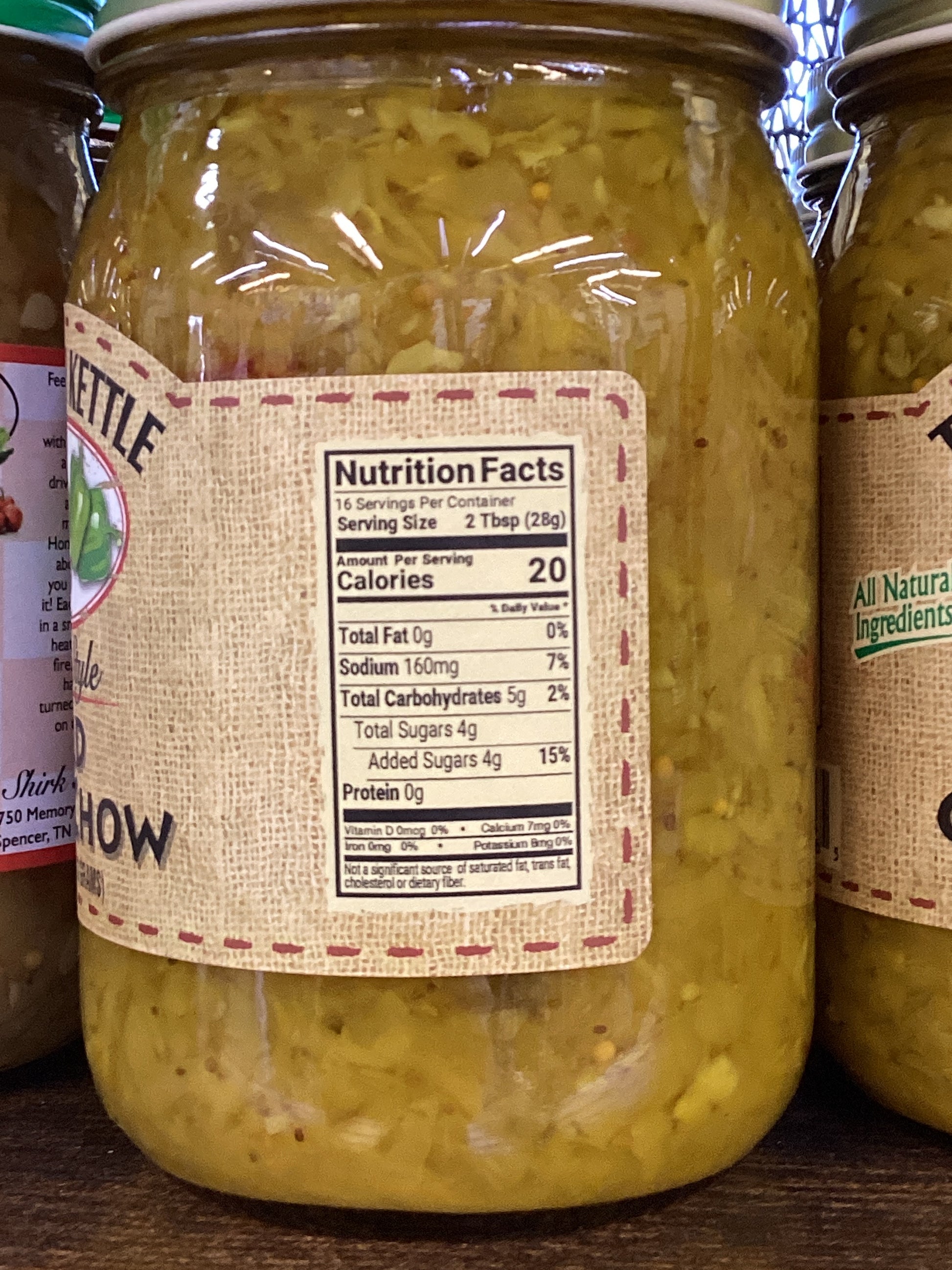 Ingredients: Cabbage, Water, Sugar, Onions, Vinegar, Peppers, Jalapeños, Salt, Turmeric, Mustard seed, Celery seed