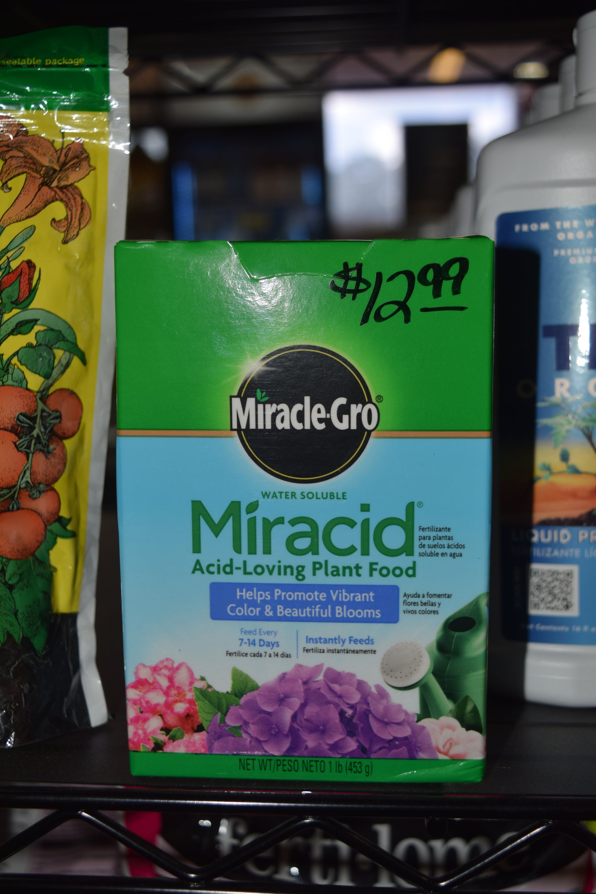 Help your acid loving plants thrive with Miracle-Gro® Water Soluble Miracid® Acid-Loving Plant Food. This water soluble fertilizer helps promote vibrant color and beautiful blooms. It feeds instantly, and is great for use on acid-loving plants, including azalea, camellia, gardenia, hibiscus, holly, hydrangea, and orchid. Mix ½ teaspoon (the small end of the enclosed scoop) per gallon of water for indoor plants, or 1 ½ tablespoons (the large end of the enclosed scoop) per 1 ½ gallon of water for outdoor plants. 1 lb. of Plant Food feeds approximately 400 sq. ft. of garden area. For best results, use to feed your plants every 7 to 14 days.