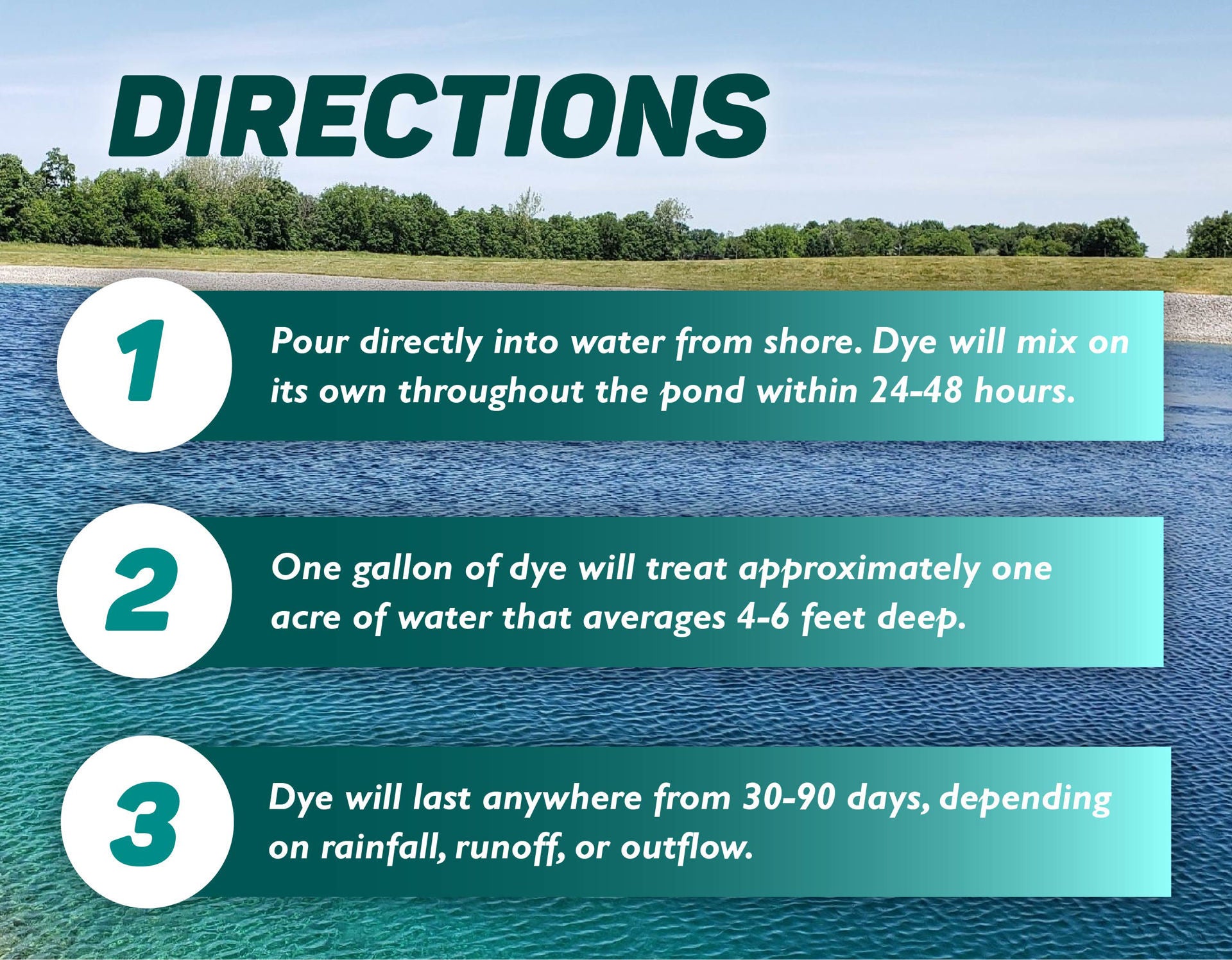 Sanco's Ocean Blue combines both blue and yellow dyes to create a beautiful turquoise pond dye. Just like our blue and black pond dye, Ocean Blue is easy to apply and safe to use with fish. Pond dye can be applied by simply pouring in around the edge of the pond in several spots. Within 24 hours the dye will mix throughout the water column. Sanco's pond dyes are extremely concentrated. Wear old clothing, shoes, and gloves when applying.