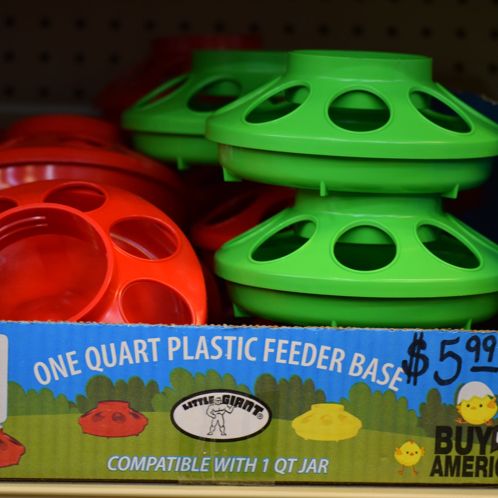 Feeder base combines with the 1-Quart Screw-On Feeder/Waterer Jar (sold separately) to make a gravity feeder for baby chicks and small birds. Features eight openings, with ribs to minimize feed overflow and spillage. 6.375 inch diameter by 2.5 inch high. Made of heavy-duty polypropylene. Can also pair onto some Mason jars.