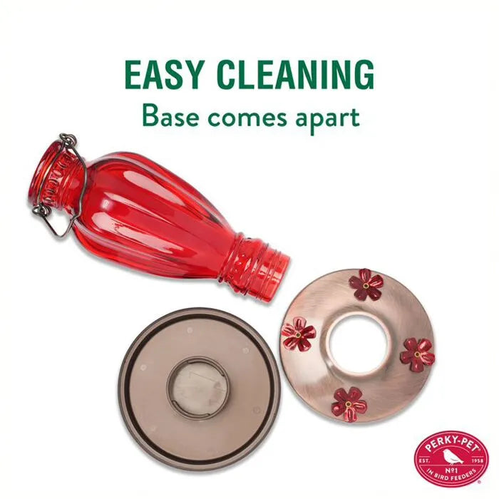 This Perky-Pet® Daisy Vase Vintage Hummingbird Feeder features a stunning vintage-style glass bottle design that fits right in with retro tastes and makes it a décor piece as well as a bird feeder. This feeder also has a beautiful red luster finish that naturally attracts more hummingbirds.
