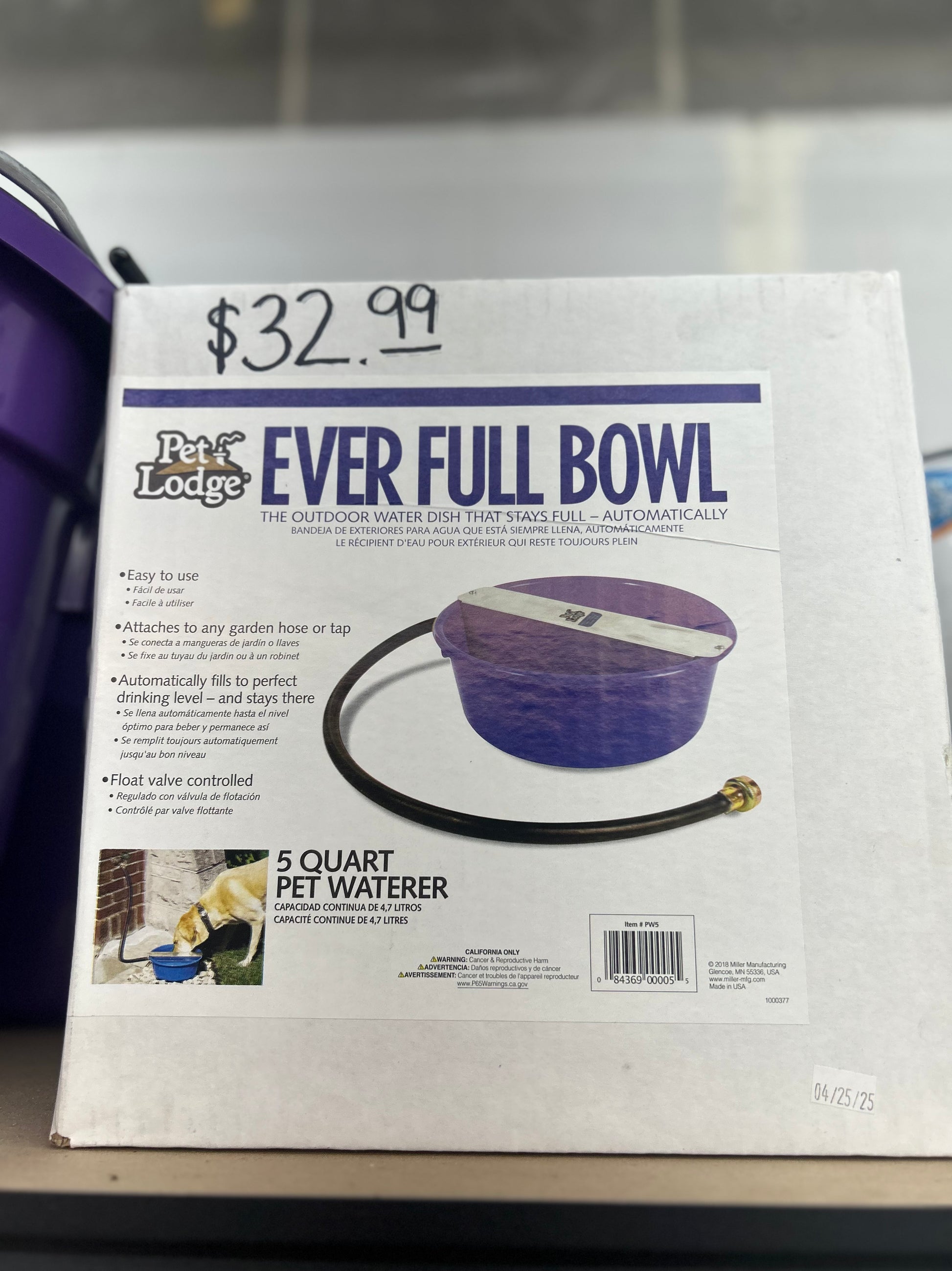 The outdoor water dish that stays full! Simply attach the 3/4 inch hose (included) to your garden hose, turn on the tap, and the bowl fills to the perfect drinking level. The automatic float controls the water level so there is no spilling or overflow. The bowl is automatically replenished every time your dog drinks, so the water always stays fresh. Made of chew-resistant, high-impact plastic with galvanized metal float assembly. Comes fully assembled.