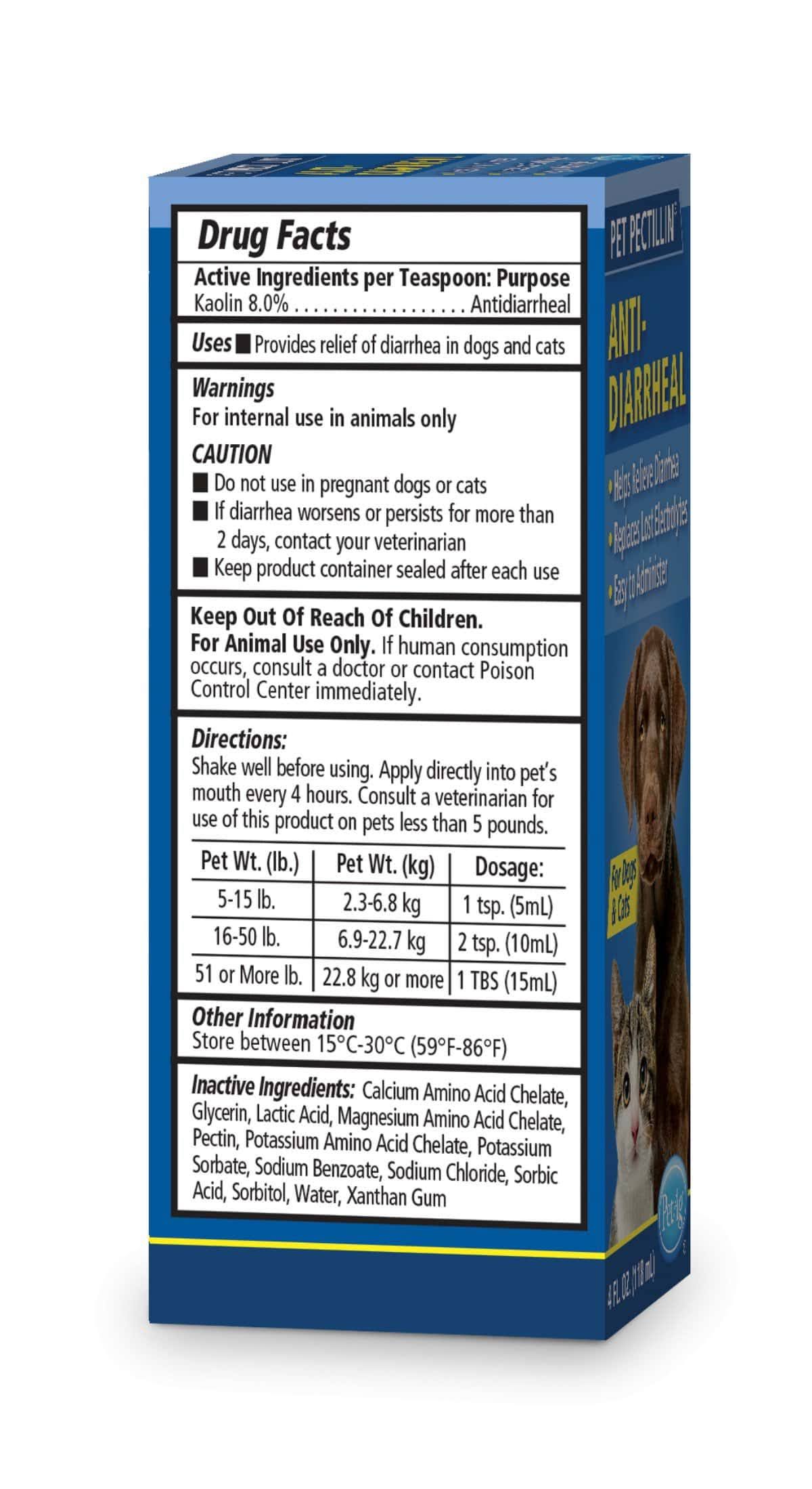 Pet Pectillin Anti-Diarrheal helps relieve diarrhea or loose stool in dogs and cats, replenishes electrolytes to aid dehydration recovery, calms the digestive tract, and absorbs toxins. It also helps alleviate irritation, discomfort and cramping associated with diarrhea.