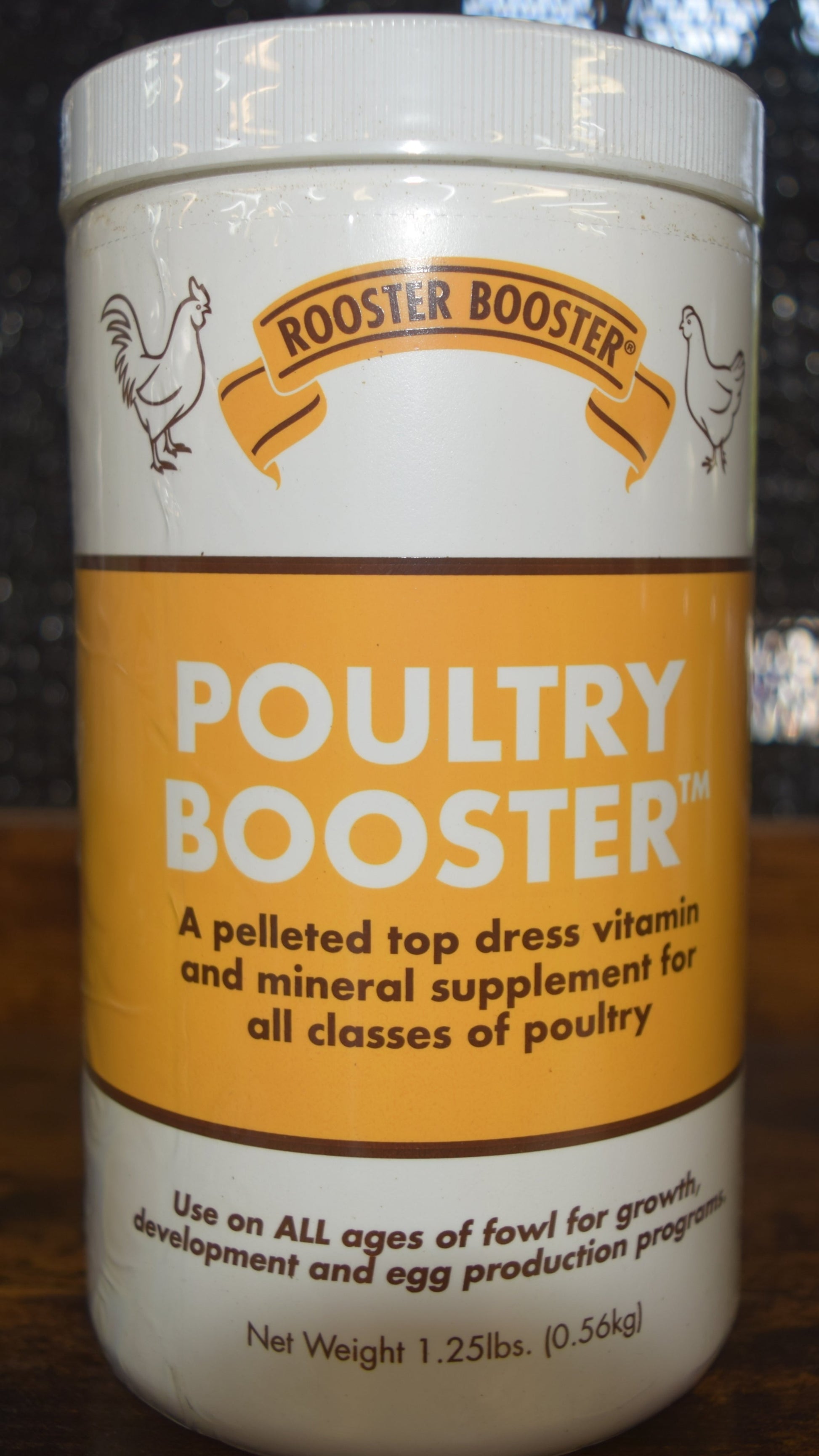 The Rooster Booster Poultry Booster Vitamin and Mineral Supplement is a pelleted top dress vitamin and mineral supplement for all classes of poultry and fowl. Use Rooster Booster Poultry Booster chicken supplements on all ages of poultry and fowl for growth, development and egg production programs. This chicken mineral supplement also contains all the vitamins, minerals and amino acids necessary for healthy, happy adult fowl including laying hens. Poultry mineral supplement can easily be administered in feed. Made in USA