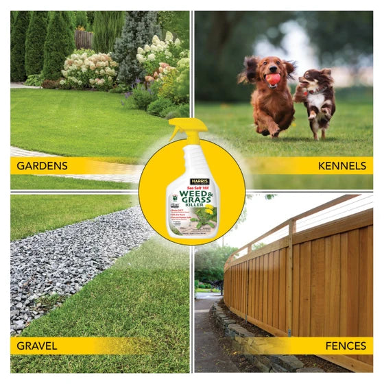 Harris Sea Salt 10X Weed & Grass Killer is a quick-acting, non-selective contact herbicide containing salt for which the residues degrade promptly in the soil. Foliar contact results in rapid desiccation and control of annual weeds and grasses, and top growth reduction of herbaceous perennial weeds and grasses. For control of established perennial weeds, retreatment may be necessary. Apply this product when weeds are small (3 to 5 leaf stage) and actively growing. Kills chickweeds, moss, crabgrass, clovers, dandelions, and many more! Our Sea salt formula is pet and human safe when used as directed.