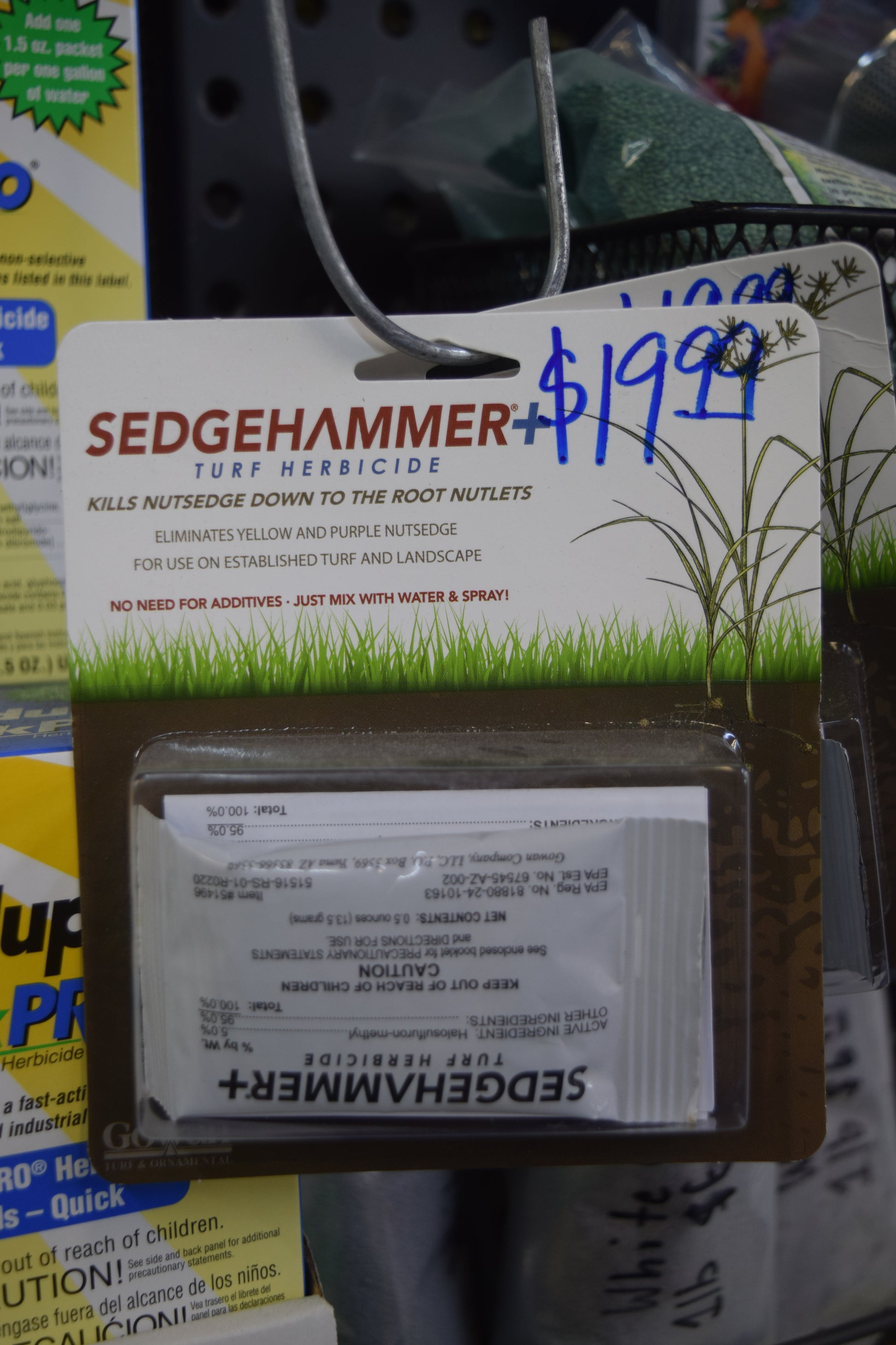 SedgeHammer+ is a selective herbicide for post-emergence control of sedges. The .5 ounce Herbicide is safe and provides consistent and complete control of purple & yellow nutsedge without harm to turfgrass, established ornamentals, shrubs, and trees. To use, simply pour the entire half-ounce packet Into 1 gallon of water & spray. It is safe to use as a direct spray on numerous turf varieties and in landscape beds. This nutgrass killer specifically controls yellow and purple nutsedge and other tough broadleaf weeds and suppresses kyllinga. This product is safe to use on nutsedge after it has emerged in turfgrasses. This product can be used without hurting turfgrasses St. Augustine grass, Bermuda grass, Kentucky bluegrass, and cool & warm season grasses.