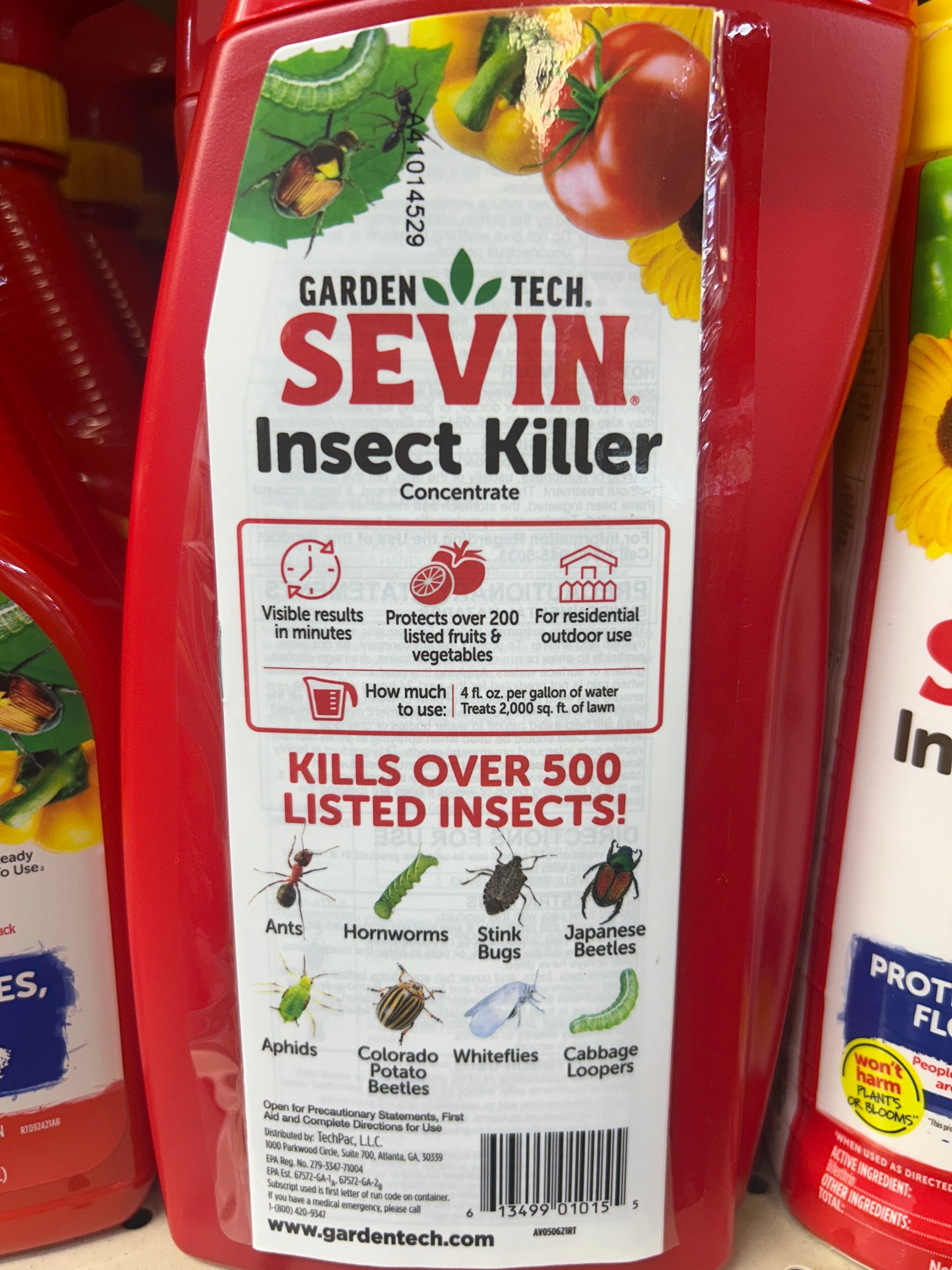Sevin Concentrate insecticide kills over 500 listed insects and protects over 250 listed fruits and vegetables. The new active ingredient of Zeta-Cypermethrin allows it to kill upon contact and see visible results within minutes, while having a residual kill of up to 3 months. It may be use in fruit and vegetable gardens, ornamental plants and shrubs, flowers and ground covers, around structures and lawns. Sevin kills imported cabbageworm, cutworms, flea beetles, stink bugs, whiteflies, aphids, armyworms, cicadas, thrips, ants, and other listed lawn and garden insects. One gallon treats 8,000 sq. ft. of lawn and to use applied 4 fl. oz. of Sevin Concentrate per gallon of water.