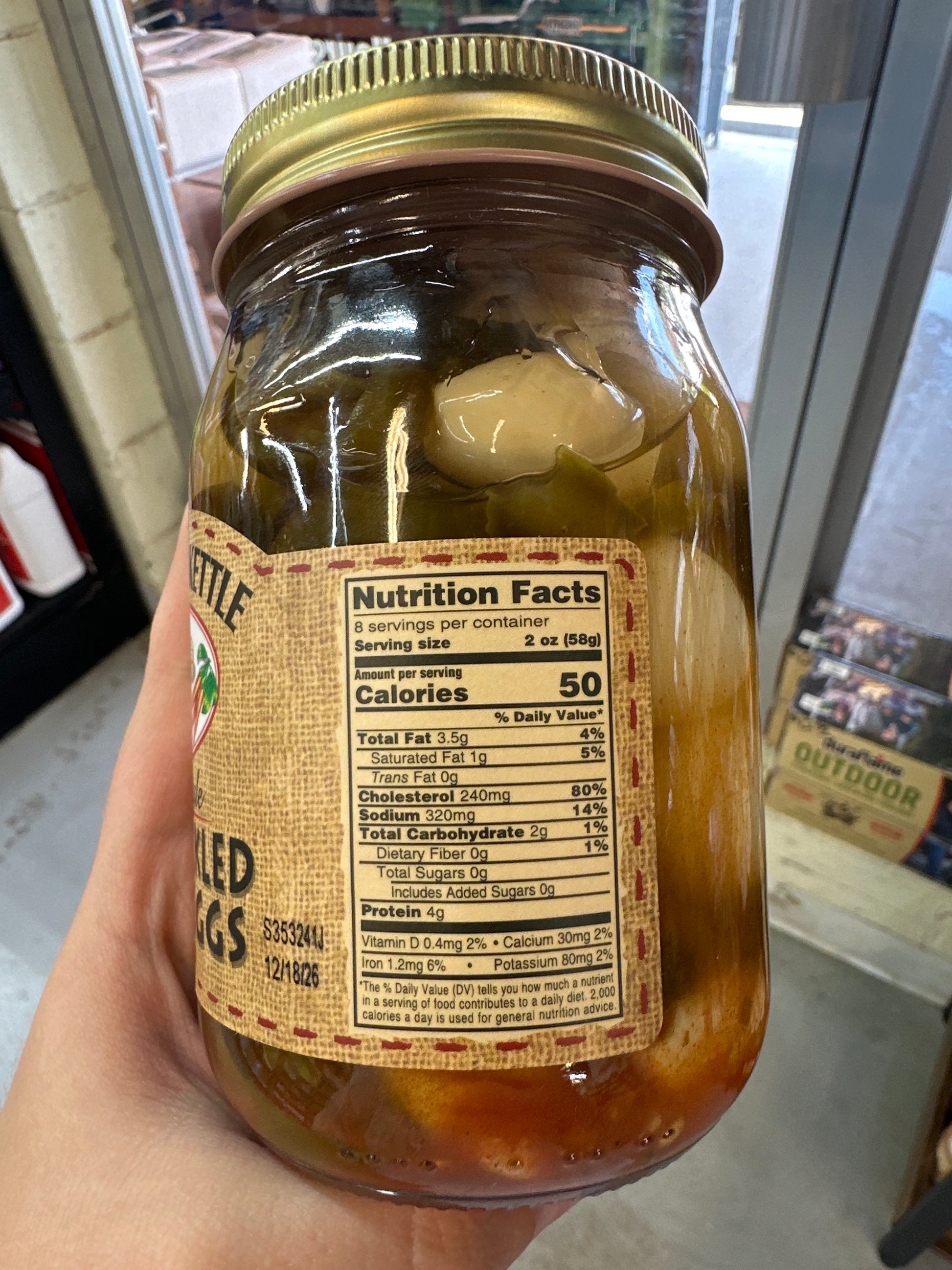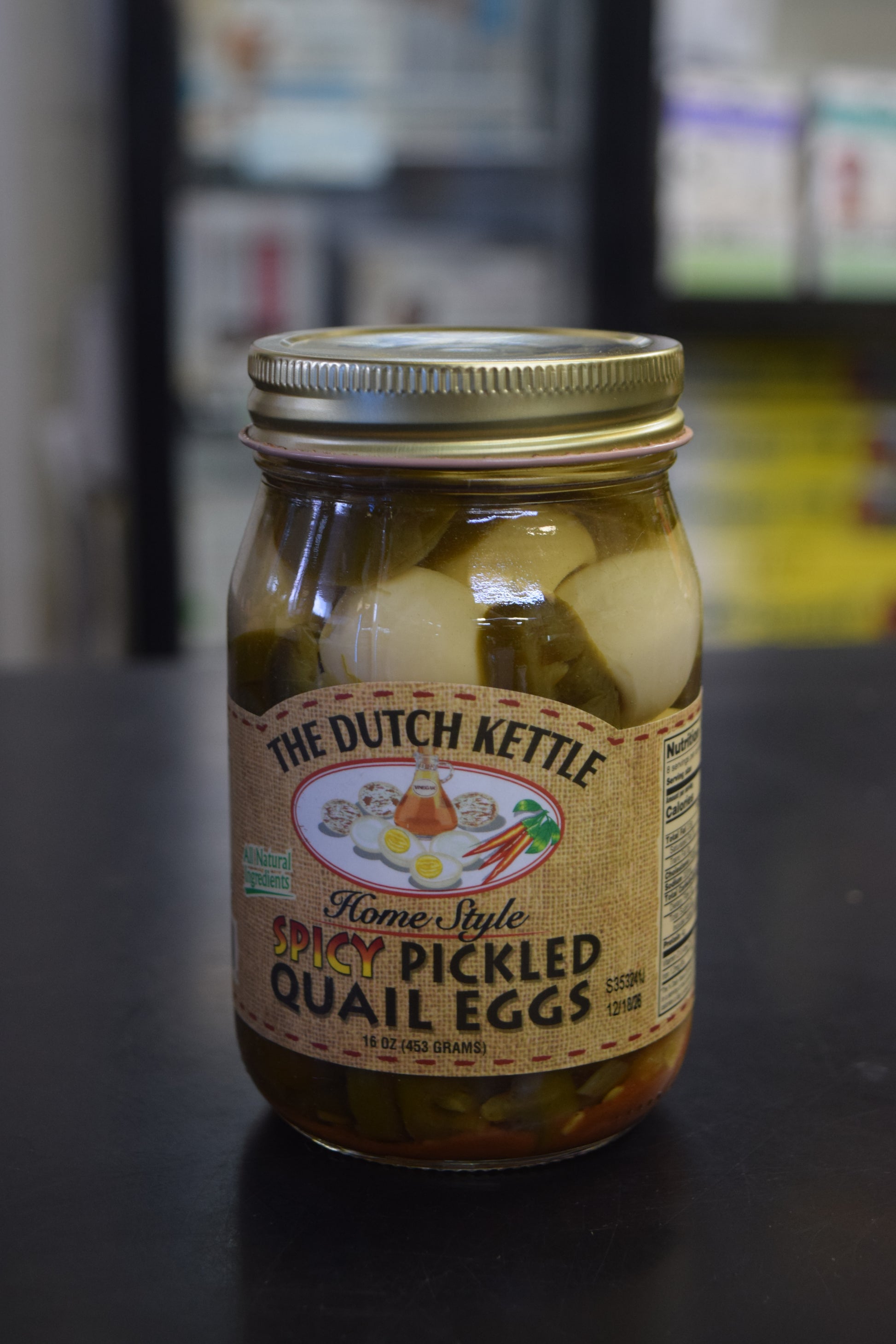 Quail eggs (quail, eggs, water, salt, citric acid, potassium sorbate), jalapeño peppers,(peppers, water, salt, calcium chloride), water, vinegar, garlic, salt, spices