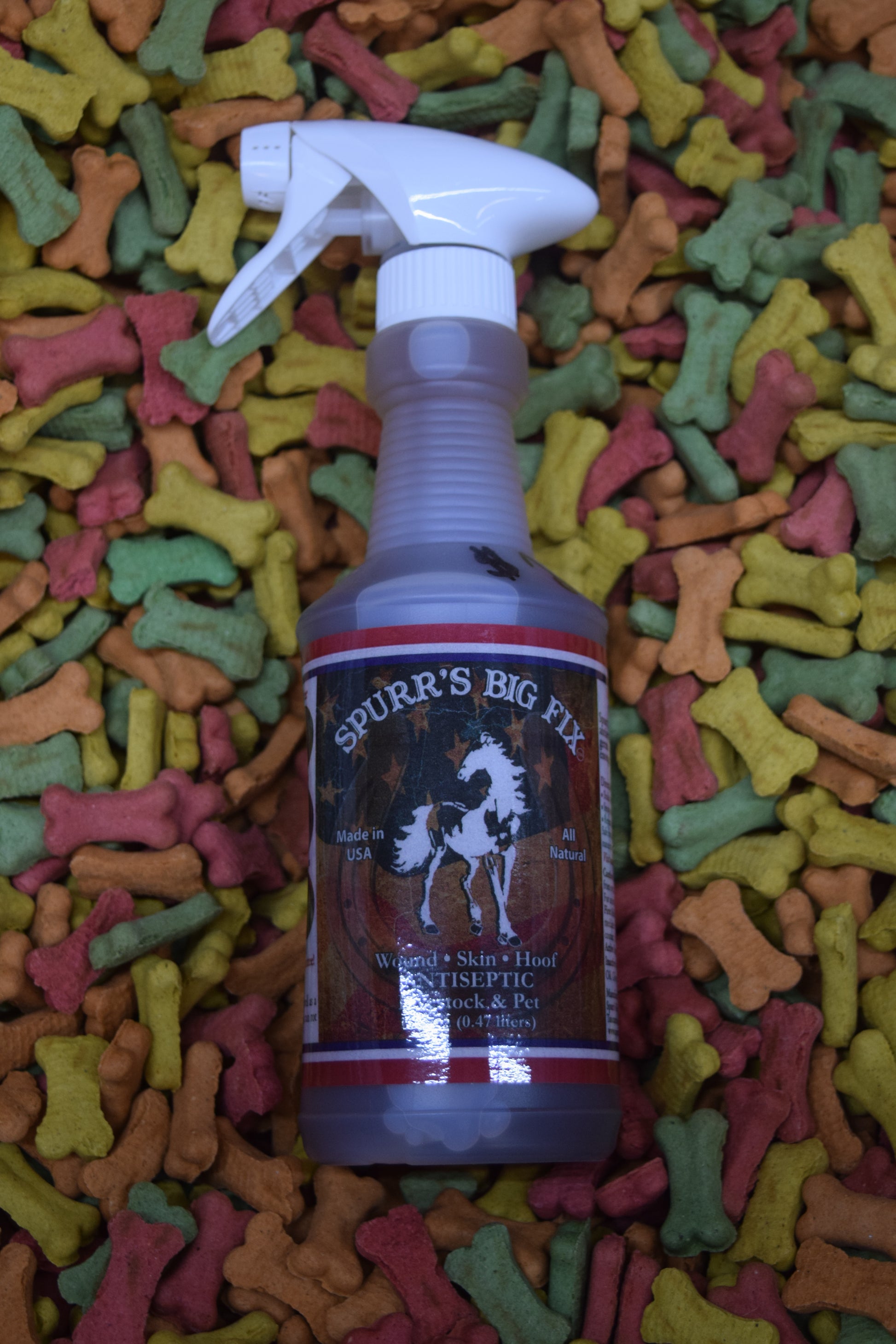Spurr's Big Fix topical antiseptic spray is formulated restore moisture making the hoof more pliable and to treat the equine hoof of all conditions including thrush, white line disease, seedy toe, brittle wall, abscesses, and hoof wall separation. Spurr's Big Fix antiseptic spray is also effective as a wound care antiseptic and antiseptic treating skin diseases including rain rot, dew poisoning, sweet itch, scratches, sarcoids, and burns.