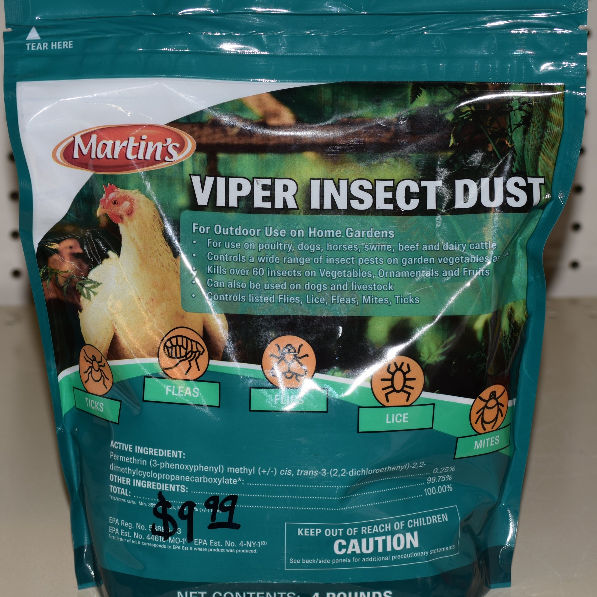 Keep your animal friends safe and protected all year round with Martin's Viper Home & Garden Insect Dust! It contains 0.25% permethrin. This broad-spectrum dust insecticide will kill more than 60 types of insects! It’s safe for use on cattle, cows, horses, swine, pigs and dogs as well as flowers, vegetables, fruit, trees and dust bags and in gardens. It’s effective against flies, horn flies, face flies, lice, Northern fowl mites, fleas, ticks, beetles, aphids, stink bug, leafminers, armyworms and cutworms.