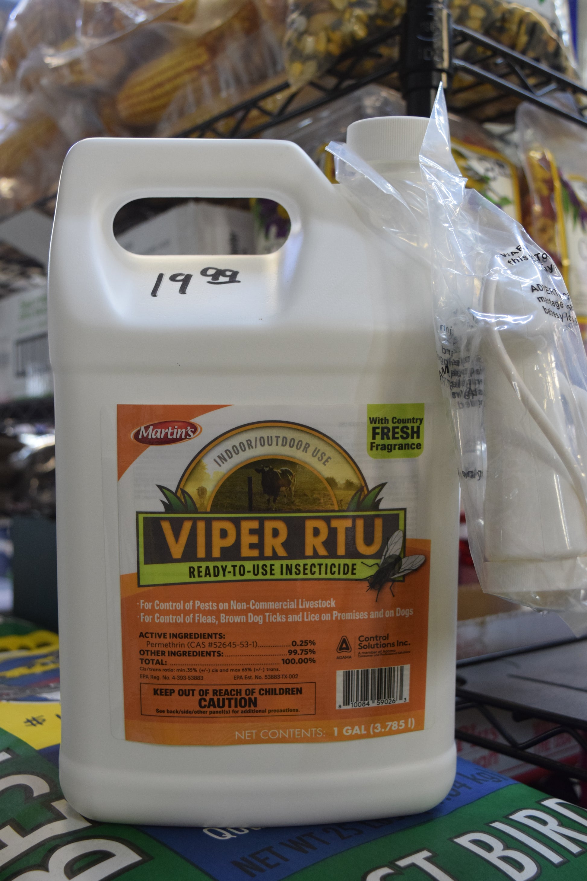 Viper RTU insecticide is a versatile ready-to-use formula with a country fresh scent for control of pests indoors and outdoors. Safe for use on dogs, livestock, and poultry. Viper RTU provides 60-day control of fleas, cockroaches, bed bugs, and many other insects.
