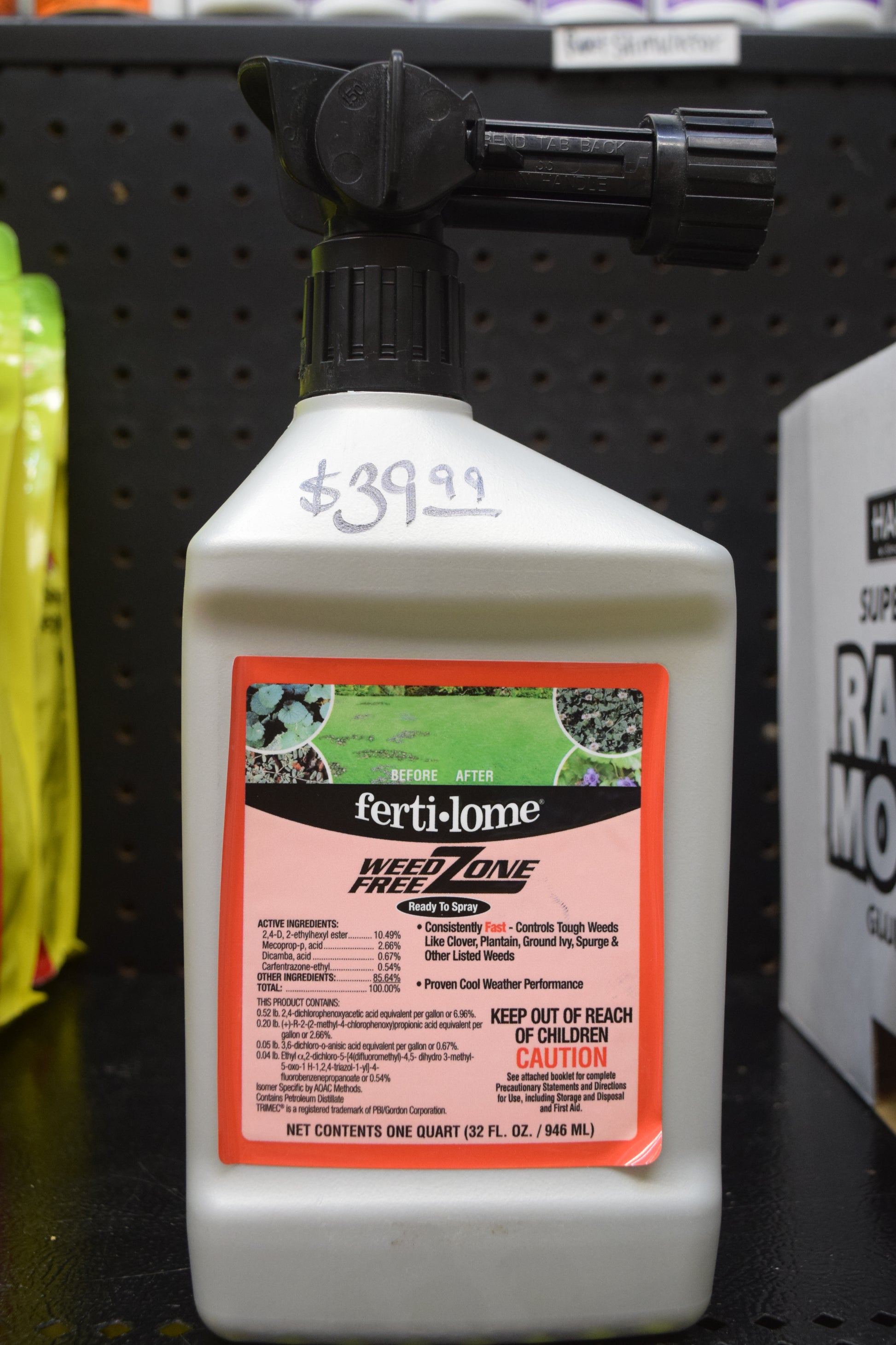 Professional strength ferti-lome Weed Free Zone with a convenient hose-end spray nozzle! Weed Free Zone is our quickest working broadleaf weed killer, and it's strong enough to kill mature weeds in your lawn. It controls over 80 of the toughest-to-control broadleaf weeds including clover, bindweed, spurge, chickweed, dandelion, henbit, oxalis, poison ivy, purslane, shepherd's purse, thistle, black medic, Virginia buttonweed, wild onion and many others. Use it in fescue, Kentucky bluegrass, ryegrass, Bermudagrass, zoysia, and buffalograss - without harming the grass. 1 qt. (32 oz.) bottle.